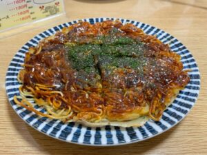 メニューは、ピリ辛面を使った「赤ゴジ」というお好み焼きや、エビやイカが入ったお好み焼きもあるんですが、いつも定番の「そば肉玉」にしちゃうんですよね^^;