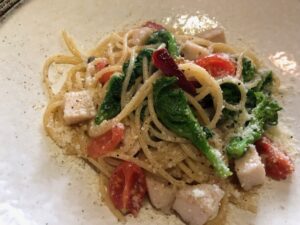お次は、甘鯛の鱗揚げ、天使海老のソテーです